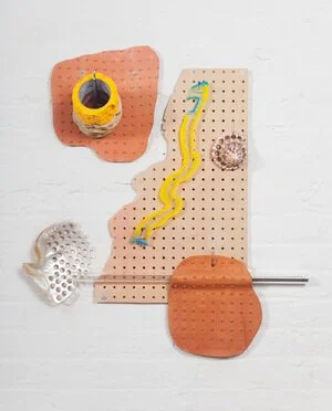 Board, plexi, ceramic, paper, masking tape, cone shell, mother of pearl shell.42"W x 47”