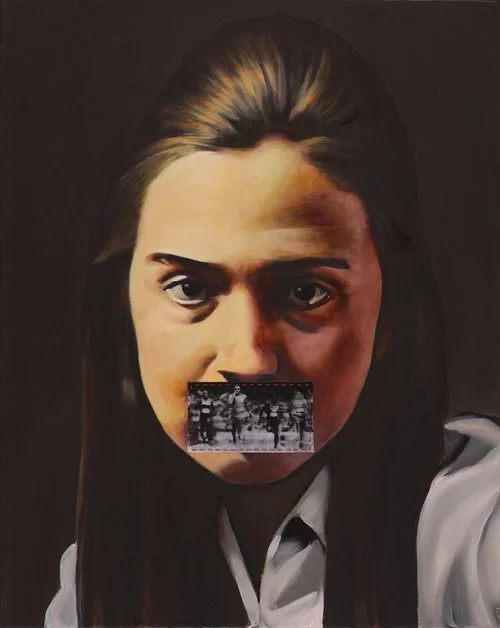 Hillary Rodham, 2012, oil on canvas with inkjet on vellum and thread, 20 x 16 inches