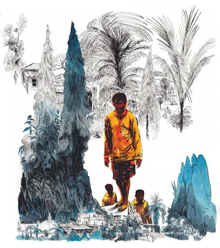 I spent all of January traveling in northern India to research a book project. A month after returning to the states, the Covid-19 health crisis shut everything down. My studio practice and work life is intertwined and comprises teaching at MICA and SVA, freelancing as an illustrator, and working on self-driven personal projects. In response to the pandemic, my classes migrated to online delivery. Luckily my studio is in my home, and was easily transitioned into an online classroom. My freelance work continued unhindered during the pandemic. Unable to travel far from home, or participate in anything resembling a social life, I was able to dedicate whatever time I had left over from my teaching and freelance illustration “day jobs” to create a new body of work. This body of work, titled “The Estates”, was inspired by the India trip and ongoing research on the history of colonial era agricultural expansion and concurrent industrial development on the American continent and in India. Specifically, I became interested in the parallels between the founding of the United States, and the expansion of colonialism within the Indian subcontinent in the 19th century.