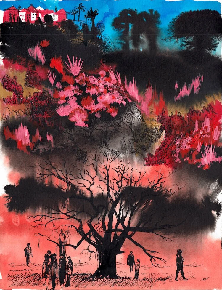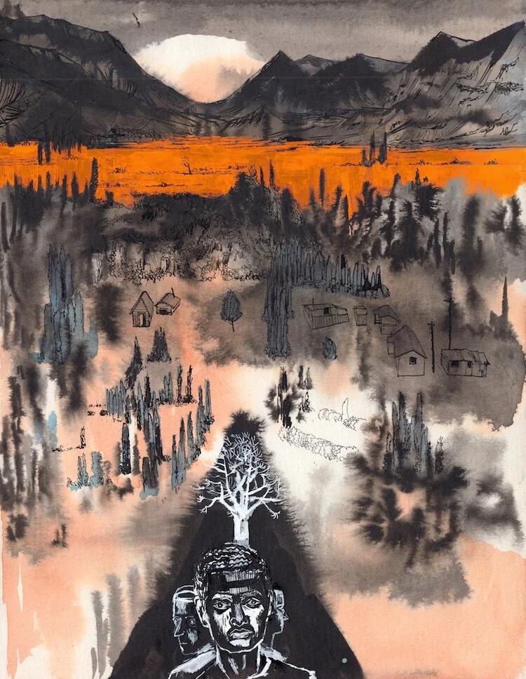 Prior to this series, my landscapes drawings were largely in black and white using pen and ink. I preferred the starkness of the media—it is both neutral and emotionally austere. With this new work I wanted to pull away from that fixed tonality and find ways to add randomness and unpredictable elements to my working process. These drawings start with a wet on wet process. I brush water on the entire page and start sketching in colored ink, and sometimes layer black ink on top of that, such that the initial ink washes bleed and blend together in ways I can’t control. I treat a number of pages that way and sit with them for a while. Next, I draw in the landscape details from a combination of reference photos, onsite sketches and imagination, working in and around the rippled ink spills. A final layer, sometimes using gouache, creates flat bold colorful elements. I use an acrylic gouache, which allows me to work back into the flat color areas and add more detail. Given the intricate layering, these pieces are created slowly and worked on simultaneously. As I experiment with narrative elements or techniques on one, and discover something that works, I can apply these discoveries to other works in the series. This improvisational process allows the images to grow together and organically layer by layer. Though I’m working from a set of references, and focusing on a particular, pre-determined theme to arrive at a coherent series, the improvisation applied to each single piece allows for surprises, and unpredictable, unplanned interactions within a drawing.