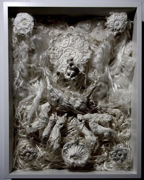Pablo Garcia Lopez, “Small Bas Relief, II” Natural silk fibers, shadow box, plexiglass covered, 16x11x 2 inches, 2019