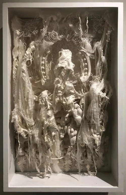 Pablo Garcia Lopez, “Small Bas Relief, I,” 2019 Natural silk fibers, shadow box, plexiglass covered, 16x11x 2 inches