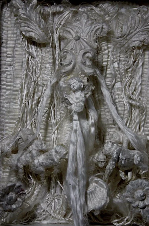 In the large box work, “Ecstatic Seizure,” Garcia Lopez reflects on the agonies of St. Teresa to propose a new reading of this famed Catholic figure. He twists Bernini’s famous sculpture of The Ecstasy of Saint Teresa to introduce figurations of the brain stem, corpus callosum, and elastic neurons, pointing to the possibility that her visions were auras, her raptures the torments of epilepsy, alternately understood in a different time. Her head floats above her body, mind and flesh divided but reunited in neurological speculations of a catholic order. The cast fiber alludes to marble but the spun silk softens the rawness of the depiction.