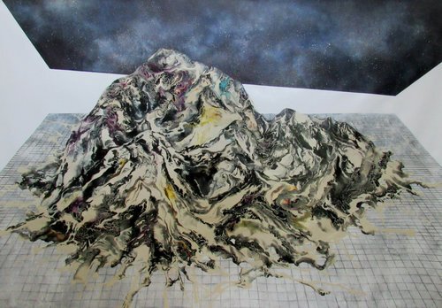 I came naturally to painting—it is something I never really questioned, although I was feeling somehow frustrated sometimes with the flat surface and the constraint brought by the frame of a canvas. It was difficult to excavate something from it, make things appear with depth and mystery, as if they were coming from the other side of the mirror. I like this challenge. I painted landscapes pretty much from the start, they were much more figurative than suggestive back then. I think I was afraid to fall into something too abstract. With time, I started to use more geometric shapes and graphic lines, and then topographic grids I had made on computer, mixed with organic forms and colors. I wanted to challenge the surface, to give it depth, to play with different scales, to extend the landscape, embrace scales from the universe to an atom and vice-versa. I tried some sculpture and mosaic as a student. At some point I would like to explore 3-dimensional mediums again.