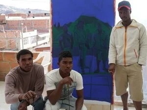 Jose Luis, Gabriel, and Jose Fernando with their painting at the foundation, Soacha, Colombia