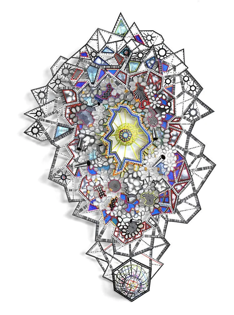 The evolution of Baker’s work from representational tableaus to sculptural installations has seemingly followed a similar trajectory. If we imagine an underpinning cellular or crystalline structure scaffolding “This is POKEY”, we might arrive at “Albatross”. The piece, from 2019, is comprised of painted hand and laser cut paper, and references Samuel Taylor Coleridge’s epic poem “The Rime of the Ancient Mariner”. Baker adds, “I have always been open to the opportunity of change. My paintings didn’t make sense when I moved back to NYC ten years ago. The infrastructure of the city reinvented my vision, and mathematical formulas offered me a comfort and stability in this era of anti-scientific bias. For me there is always a crossover of using materials in a painterly way, and infusing them with conceptual heft.”