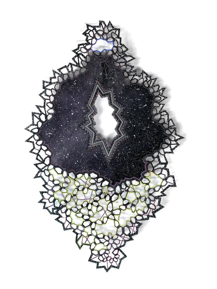 Nancy Baker, Rust and Stardust, 2019, Paint on hand and laser cut paper, 26” x 24”, based on a quote from the novel Lolita, by Vladimir Nabokov