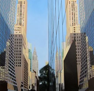 Yes, absolutely! I paint a lot of the older buildings with the idea that I will capture what is here today that might not be here tomorrow. Many of the places I’ve painted over the years are gone. They exist on a canvas but they’re physically gone. As far as the new architecture, I don’t like a lot of it. I tend to like the older buildings, the architectural details, the terracotta work. But as far as the glass facades of the newer buildings, they do provide a nice surface for reflections. Reflections of older buildings on newer buildings is a subject I find fascinating, and I have done many paintings along that theme. But I think a lot of these newer buildings lack character.