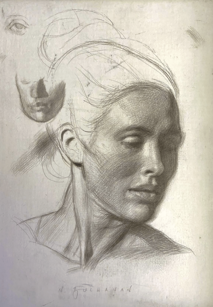 Image: Noah Buchanan, "Head Study for Victory," 2019, Silverpoint, Gesso on Panel, 8 x 6 inches