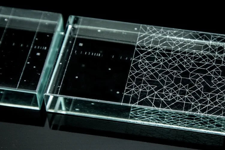 The exhibition functions as a memory archive and cosmic timeline, following the small and the invisible from the beginnings of time, to the here-and-now. Upon entering the gallery, viewers will encounter glass blocks: intricate engravings, carved in thick, scientific glass, that delineate a complete mapping of the universe. Ink drawings on paper trace earthly detritus to their cosmic origins. Glass-panel engravings explore the history of dust particles in interstellar space. A soundscape of the interactions of electromagnetic particles from the solar wind, ionosphere, and various planets’ magnetospheres permeates through the gallery.