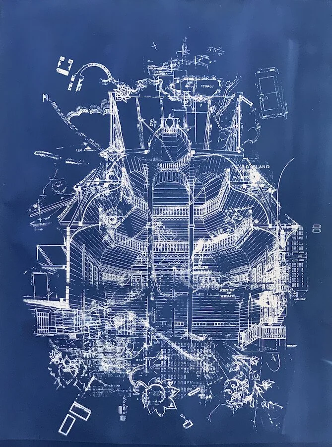 Equity Gallery is pleased to present Maya Ciarrocchi’s Site: Yizkor, the long-awaited culmination of New York Artists Equity’s Residency Fellow Program. Through an expansive series of multidisciplinary artworks, including drawings, monotypes, cyanotypes, and photographs, Ciarrocchi carefully excavates and pieces together disappearing histories from the remains of architecture and fragmented memories, in the process recreating a complete visual story. The compilation of disparate materials to reconstitute and rebuild fractured narratives is deliberately employed by Ciarrocchi to evoke a Yizkor book, a type of memorial books written by Jewish Holocaust survivors to commemorate the people and places destroyed. She synthesizes the power in documentation, demonstrates how it plays a role in forging narrative, and shows how narratives can help people overcome seemingly insurmountable loss. Ciarrocchi combines and superimposes an aggregation of disparate components, such as blueprints, maps, topography, architecture, the human form, and Old Testament figures.