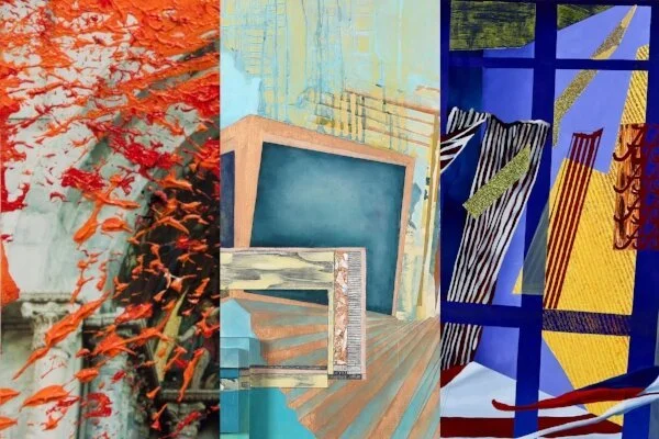 Image Left to Right: Audrée Anid, Fractured decorum, From the series Re-Fractions (2013), Oil paint on C-Print, 4” x 6”; Kelly Olshan, The Farther (2015), Oil, acrylic, recycled paint and tape, molding paste, and graphite on 3D panel, 50” x 55.5” x 7”; Jamie Earnest , Sins Against Alabama (2017), Oil, foil, graphite, wax, and marble powders, 38” x 60”