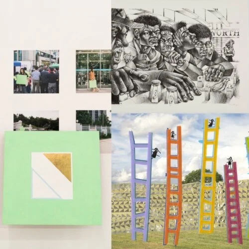 Left: Doug Ashford, Photographs of Paintings Carried to Places where the Movement for Democracy in South Korea Happened, and Four Examples of what was Produced (2006), pigment and gold on wood, hardware, photographs, dimensions variable; Top right: Steve Prince, Salt of the Earth (2017), lithograph, 22”x30”; Bottom right: Michelle Westmark Wingard, Allie Wingard, and Naomi Wingard, We Will Build Ladders 6 (2016), digital c-print, washi tape, permanent marker, 16"x20"