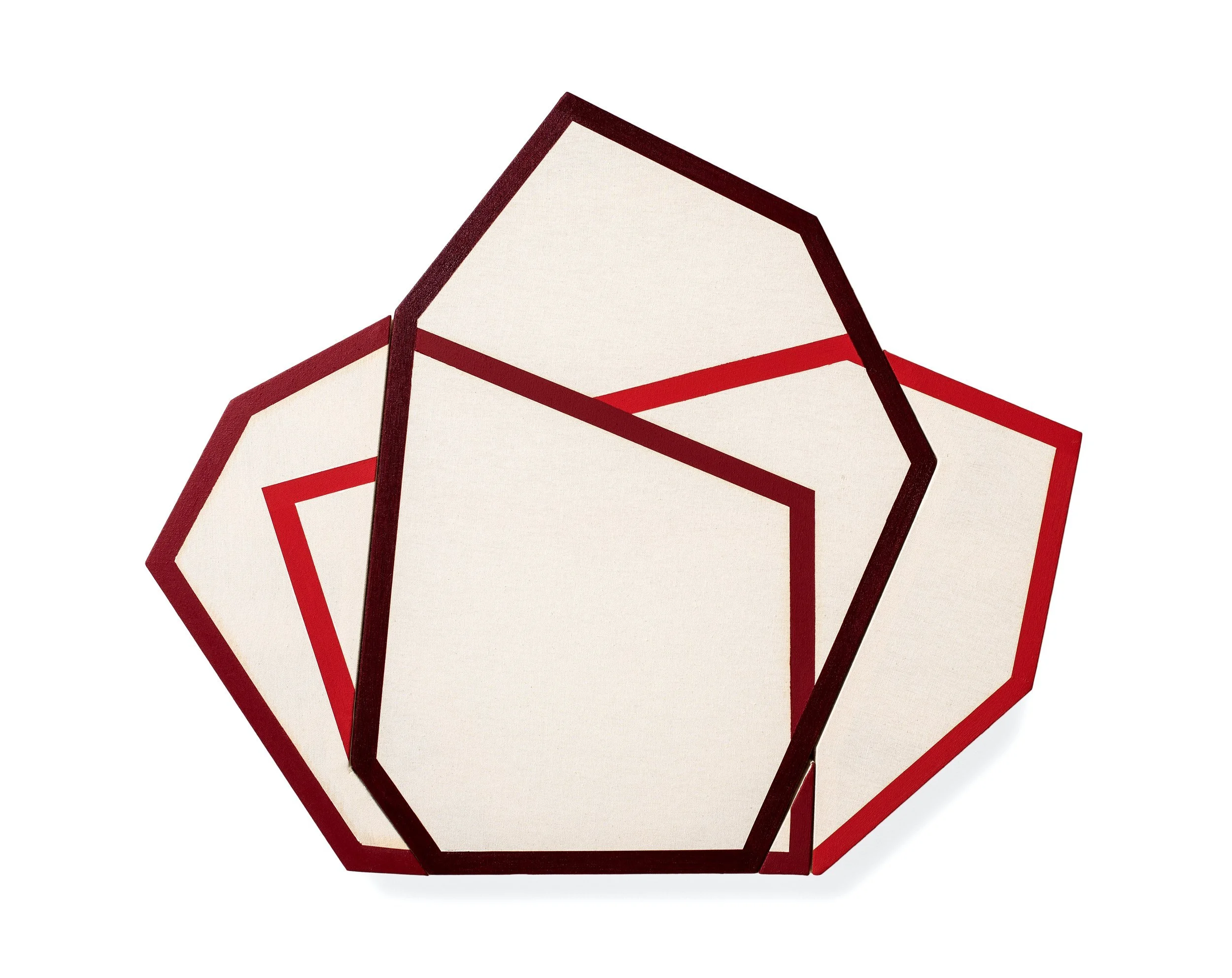 Gymnastics presents a group of improbably shaped paintings that tumble and bound, reveling in the gloriously demolished distinction between painting and sculpture. Made of wood, canvas, paint, and aluminum, much of the collection features a trio of shapes that rotate and interlock. Bands of vibrant primary colors walk the perimeters of each structure, underscoring their physicality while simultaneously moving freely into the canvas, celebrating the illusory and painterly. Gymnastics invites the viewer to play, untethered from the conservatism of the rectangle.