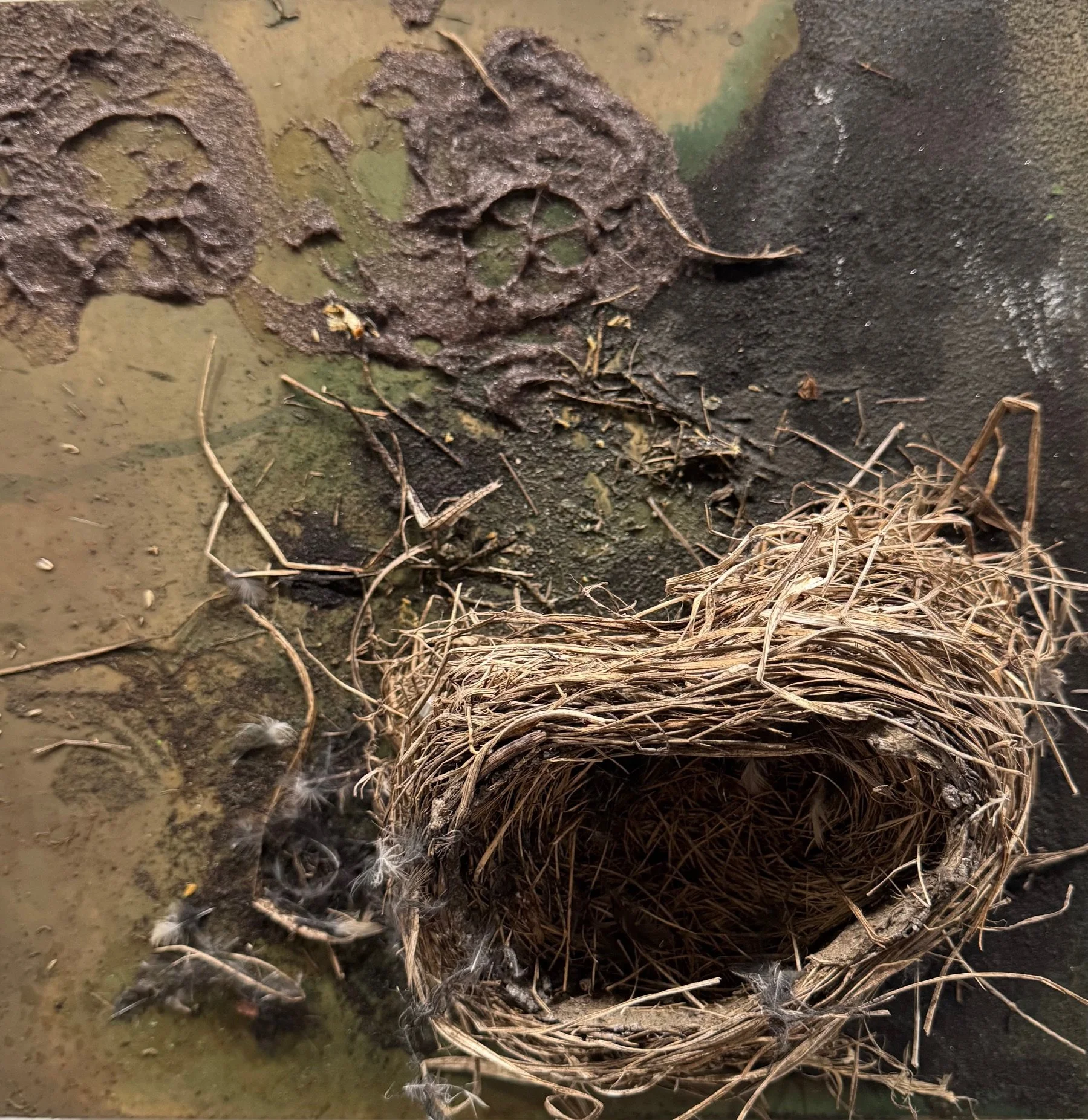 (collab. with Absent Winged Collaborators and Honey Bear domestic cat), 2025, cat prints, earth, Nest and nesting materials, scattered feathers on wood panel, 12” x 12” x 4”